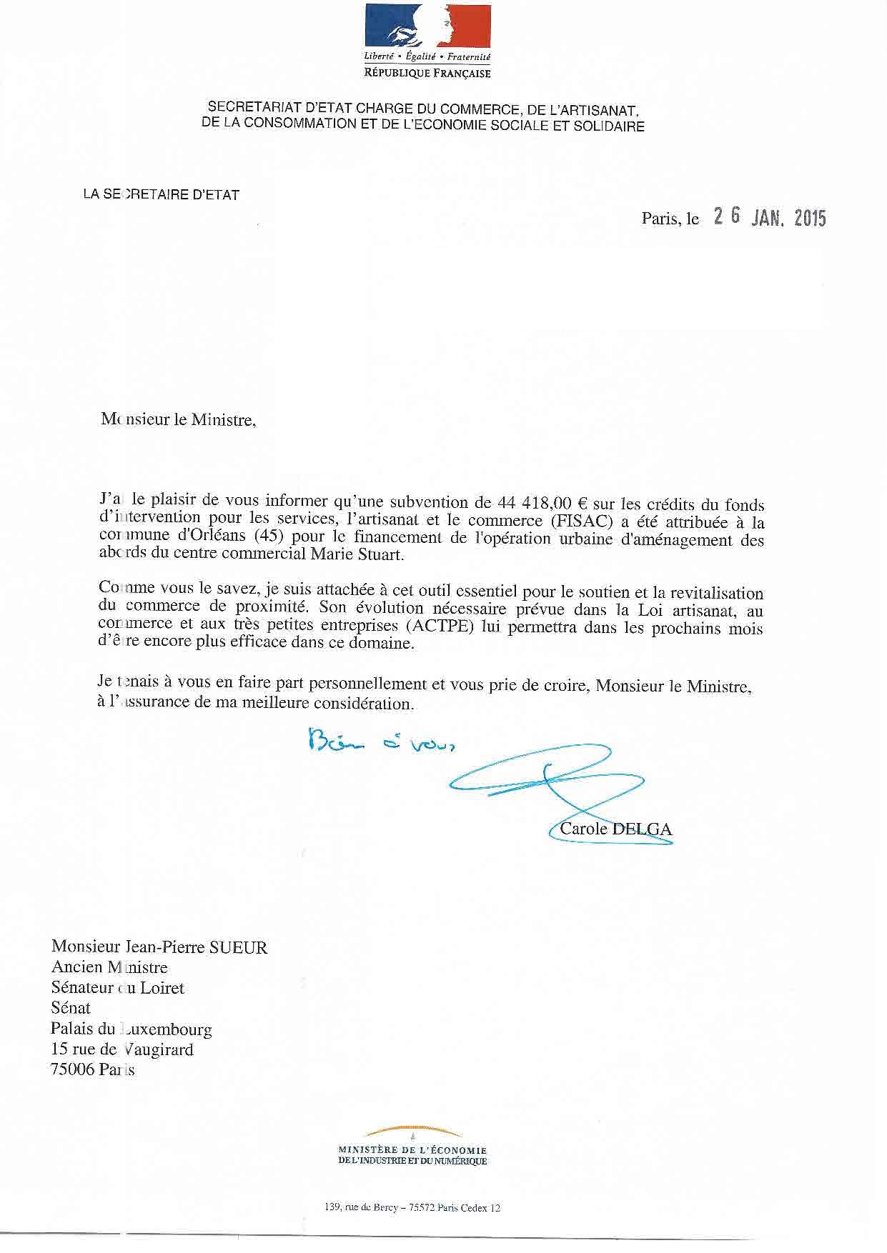 Carole Delga, au titre du Fonds d’intervention pour les services, l’artisanat et le commerce (FISAC) afin de contribuer au financement de l’aménagement du Centre commercial Marie-Stuart à Orléans.
