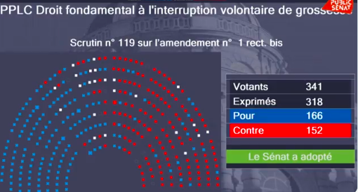 Au terme d’un débat approfondi, le Sénat a adopté une proposition de loi constitutionnelle visant à inscrire dans la Constitution la liberté des femmes d’avoir recours à l’interruption volontaire de grossesse (IVG), par 166 voix contre 152.